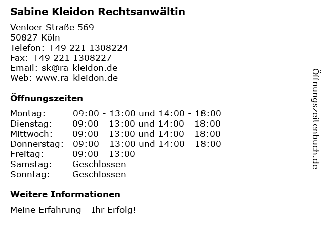 | Öffnungszeiten Sabine Kleidon Rechtsanwältin in Köln anzeigen | |