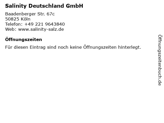 | Öffnungszeiten Salinity Deutschland GmbH in Köln anzeigen | |