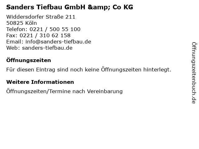 | Öffnungszeiten Sanders Tiefbau GmbH & Co KG in Köln anzeigen | |