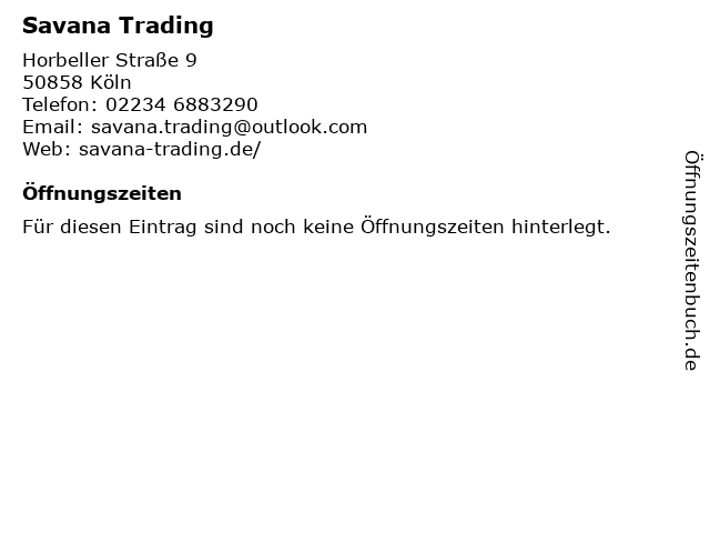 | Öffnungszeiten Savana Trading in Köln anzeigen | |