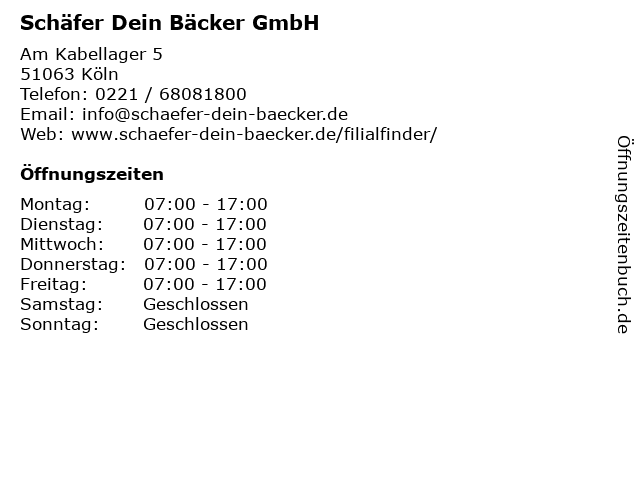 | Öffnungszeiten Schäfer Dein Bäcker GmbH in Köln anzeigen | |