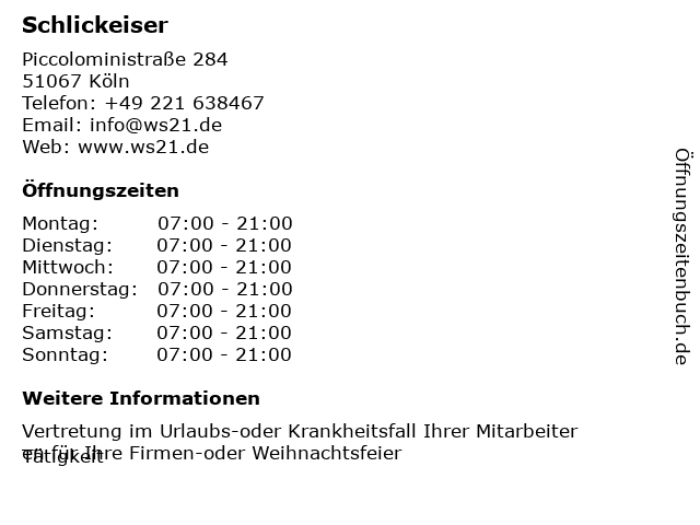 | Öffnungszeiten Schlickeiser in Köln anzeigen | |