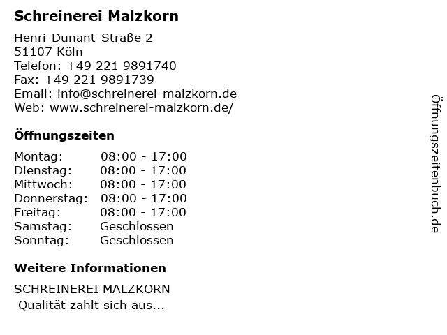 | Öffnungszeiten Schreinerei Malzkorn in Köln anzeigen | |