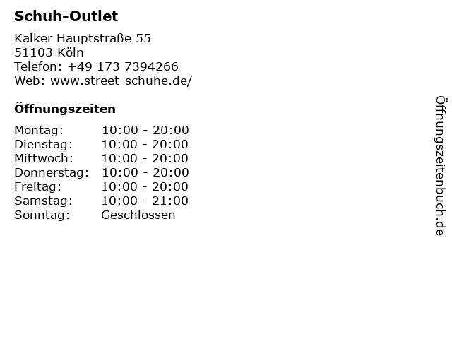 | Öffnungszeiten Schuh-Outlet in Köln anzeigen | |
