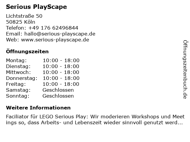 | Öffnungszeiten Serious PlayScape in Köln anzeigen | |