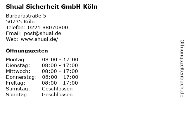 | Öffnungszeiten Shual Sicherheit GmbH Köln in Köln anzeigen | |