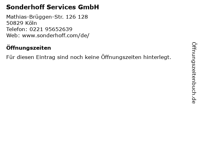 | Öffnungszeiten Sonderhoff Services GmbH in Köln anzeigen | |