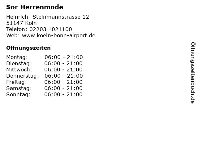 | Öffnungszeiten Sor Herrenmode in Köln anzeigen | |