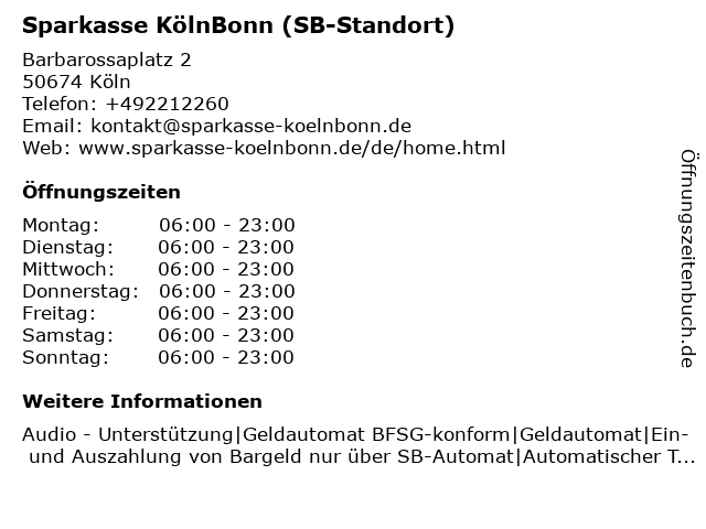 | Öffnungszeiten Sparkasse KölnBonn (SB-Standort) in Köln anzeigen | |