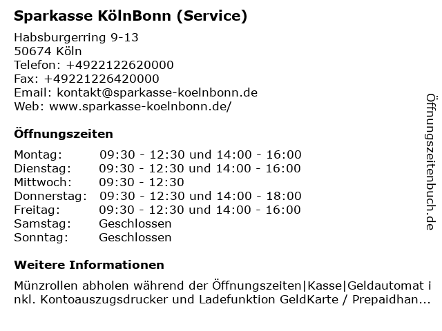 | Öffnungszeiten Sparkasse KölnBonn (Service) in Köln anzeigen | |