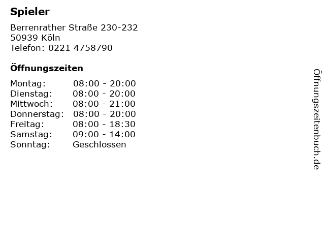 | Öffnungszeiten Spieler in Köln anzeigen | |