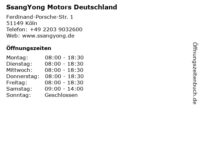 | Öffnungszeiten SsangYong Motors Deutschland in Köln anzeigen | |