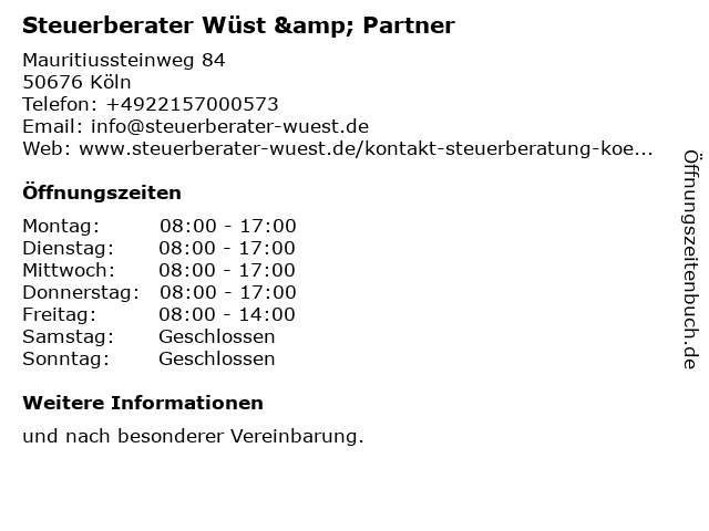 | Öffnungszeiten Steuerberater Wüst & Partner in Köln anzeigen | |