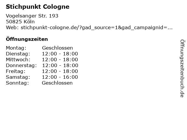 | Öffnungszeiten Stichpunkt Cologne in Köln anzeigen | |