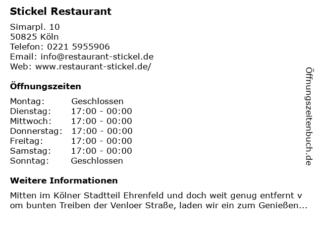 Öffnungszeiten Stickel Restaurant in Köln anzeigen | |