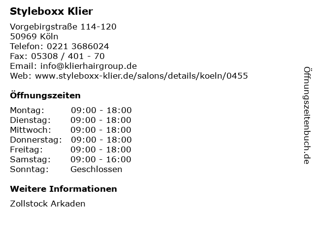 | Öffnungszeiten Styleboxx Klier in Köln anzeigen | |