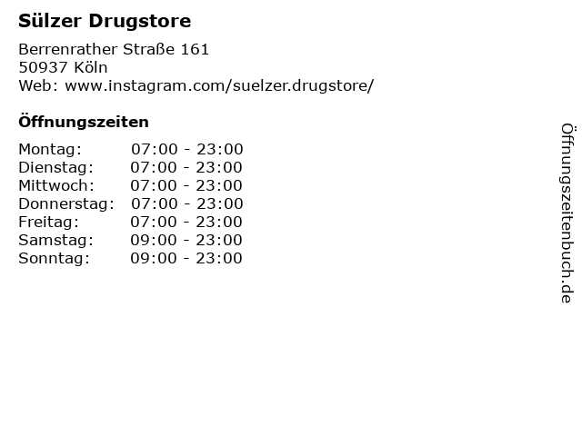 | Öffnungszeiten Sülzer Drugstore in Köln anzeigen | |