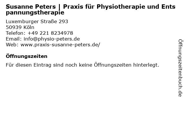 | Susanne Peters | Praxis für Physiotherapie und Entspannungstherapie anrufen | |