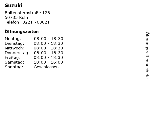 | Öffnungszeiten Suzuki in Köln anzeigen | |