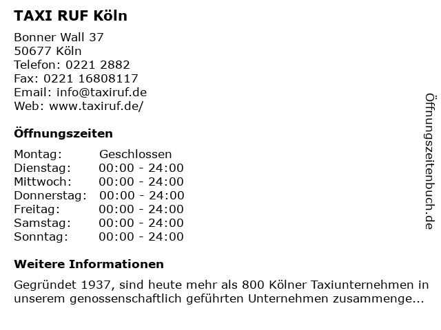Öffnungszeiten TAXI RUF Köln