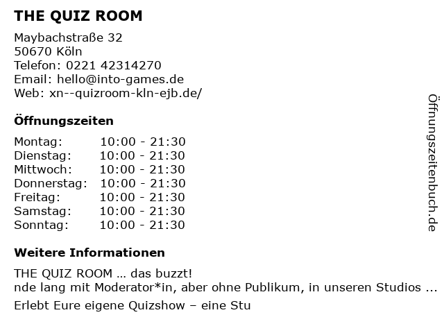 | Telefonnummer THE QUIZ ROOM in Köln (0221 42314270) anrufen | |