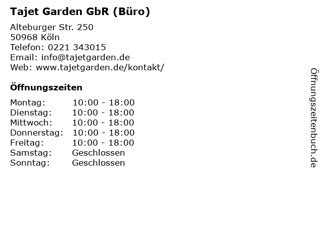 | Öffnungszeiten Tajet Garden GbR (Büro) in Köln anzeigen | |
