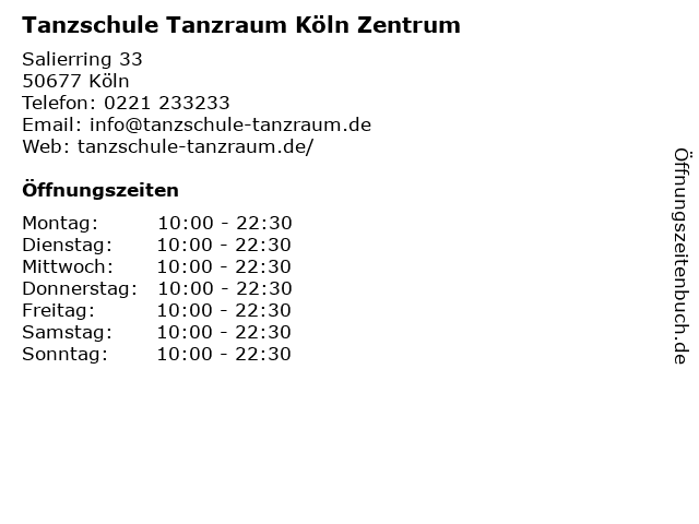 | Öffnungszeiten Tanzschule Tanzraum Köln Zentrum in Köln anzeigen | |