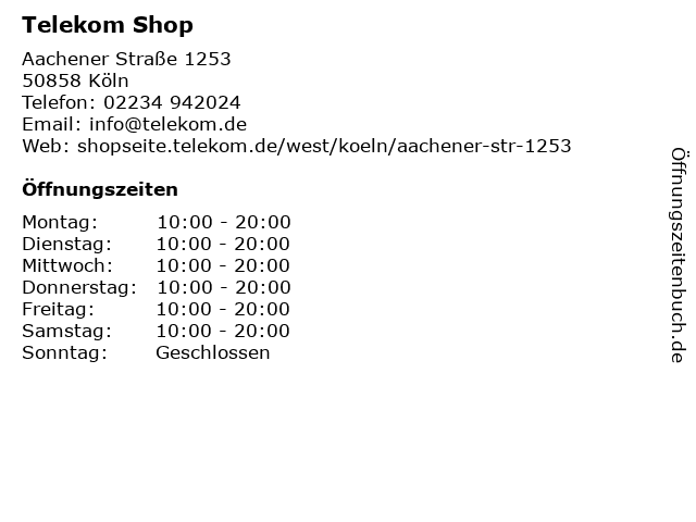 | Öffnungszeiten Telekom Shop in Köln anzeigen | |