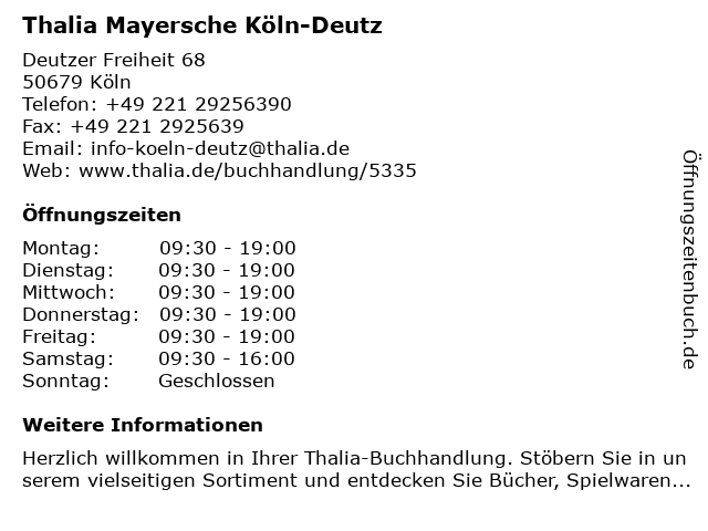 | Öffnungszeiten Thalia Mayersche Köln-Deutz in Köln anzeigen | |