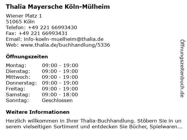 | Öffnungszeiten Thalia Mayersche Köln-Mülheim in Köln anzeigen | |