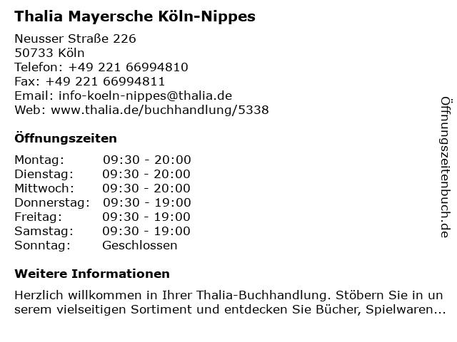 | Öffnungszeiten Thalia Mayersche Köln-Nippes in Köln anzeigen | |
