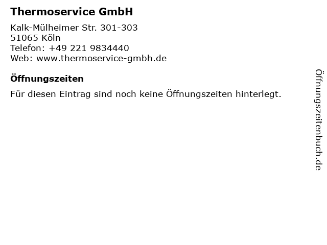 | Öffnungszeiten Thermoservice GmbH in Köln anzeigen | |