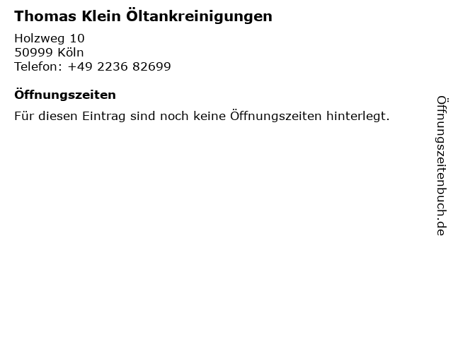 | Öffnungszeiten Thomas Klein Öltankreinigungen in Köln anzeigen | |