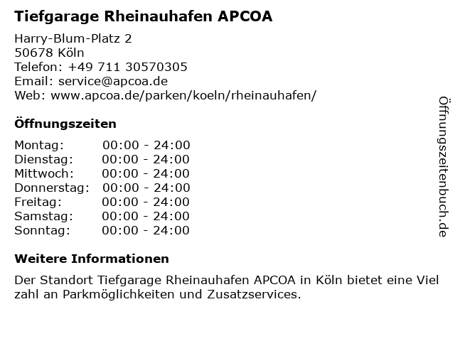 | Öffnungszeiten Tiefgarage Rheinauhafen APCOA in Köln anzeigen | |