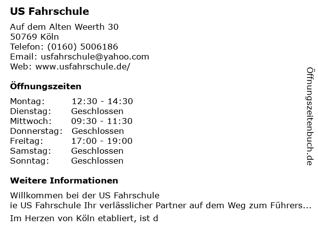 | Öffnungszeiten US Fahrschule in Köln anzeigen | |