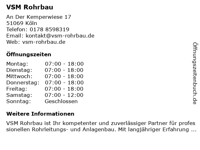 | Öffnungszeiten VSM Rohrbau in Köln anzeigen | |