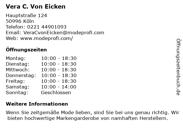 | Öffnungszeiten Vera C. Von Eicken in Köln anzeigen | |