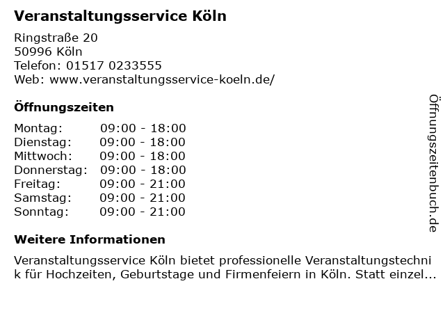 | Öffnungszeiten Veranstaltungsservice Köln in Köln anzeigen | |
