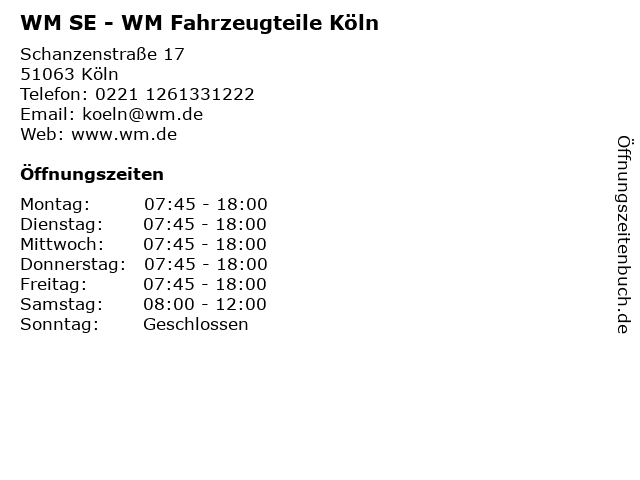 | Öffnungszeiten WM SE - WM Fahrzeugteile Köln in Köln anzeigen | |