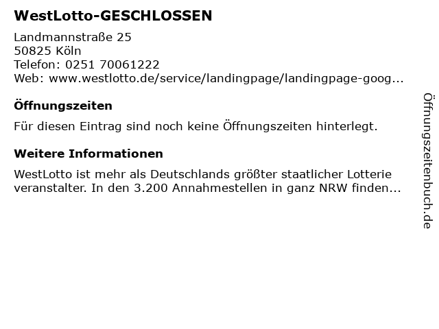 WestLotto-GESCHLOSSEN in Köln | Telefonnummer, Öffnungszeiten und Adresse
