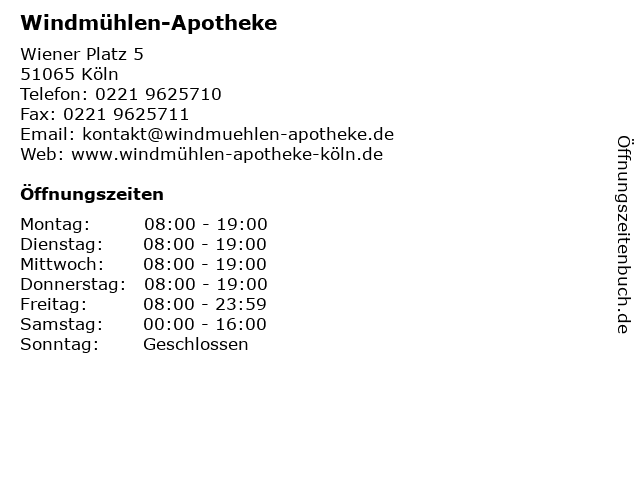 | Öffnungszeiten Windmühlen-Apotheke in Köln anzeigen | |