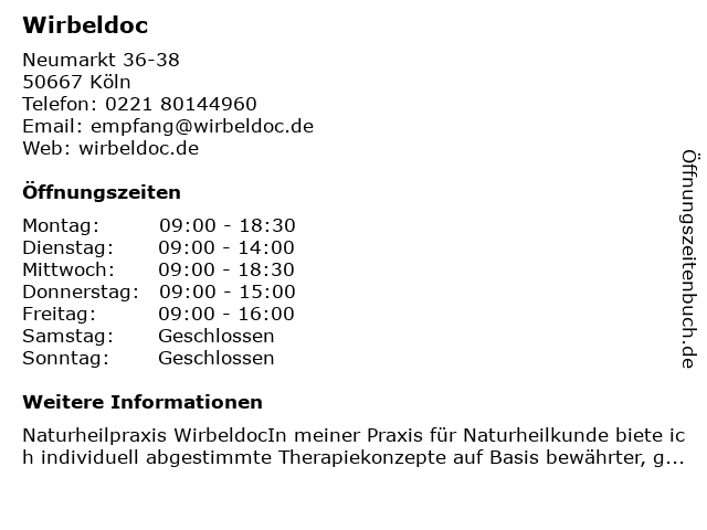| Öffnungszeiten Wirbeldoc in Köln anzeigen | |
