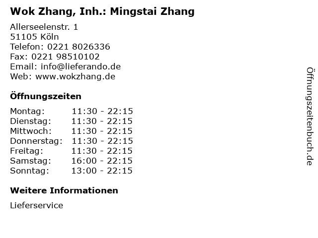 | Öffnungszeiten Wok Zhang, Inh.: Mingstai Zhang in Köln anzeigen | |