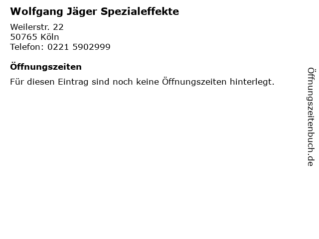 | Telefonnummer Wolfgang Jäger Spezialeffekte in Köln (0221 5902999) anrufen | |