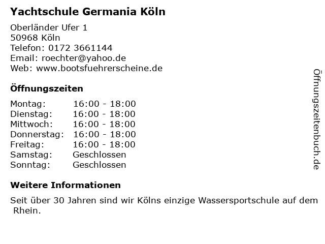 | Öffnungszeiten Yachtschule Germania Köln in Köln anzeigen | |