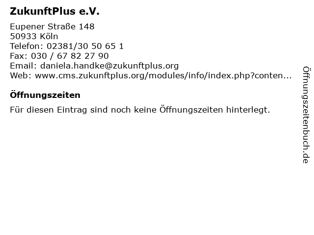 | Öffnungszeiten ZukunftPlus e.V. in Köln anzeigen | |