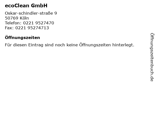 | Öffnungszeiten ecoClean GmbH in Köln anzeigen | |
