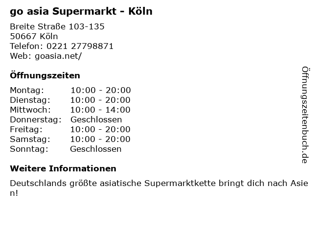 | Öffnungszeiten go asia Supermarkt - Köln in Köln anzeigen | |