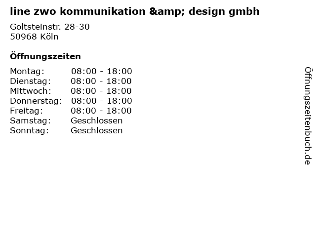 | Öffnungszeiten line zwo kommunikation & design gmbh in Köln anzeigen | |