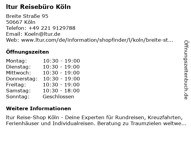 | Öffnungszeiten ltur Reisebüro Köln in Köln anzeigen | |